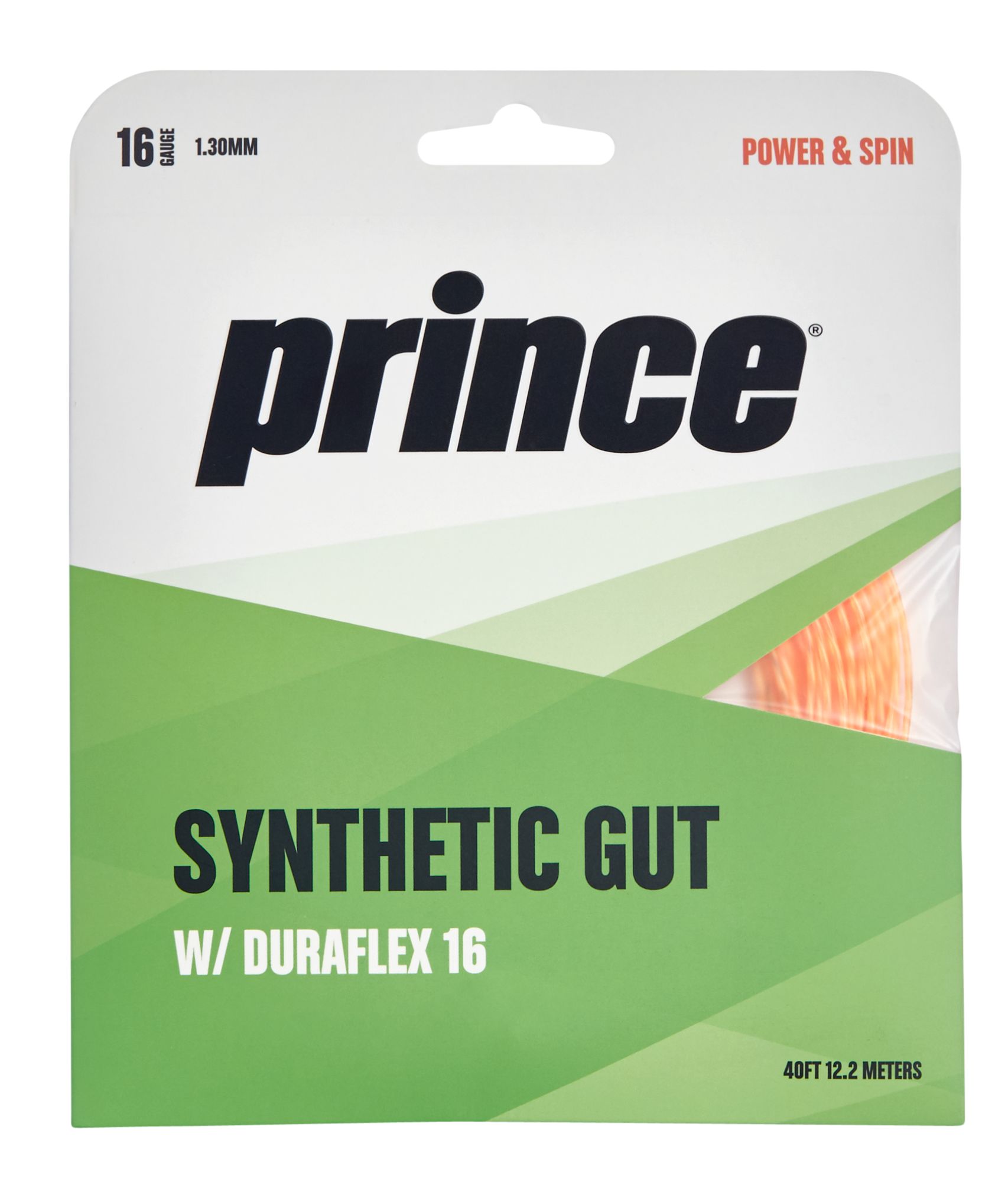 The Prince® Duraflex Synthetic Gut 16G Tennis Racquet String combines Center Core Construction with Nomex wear-resistant fibers. Duraflex provides consistency and durability for unmatched all around performance.